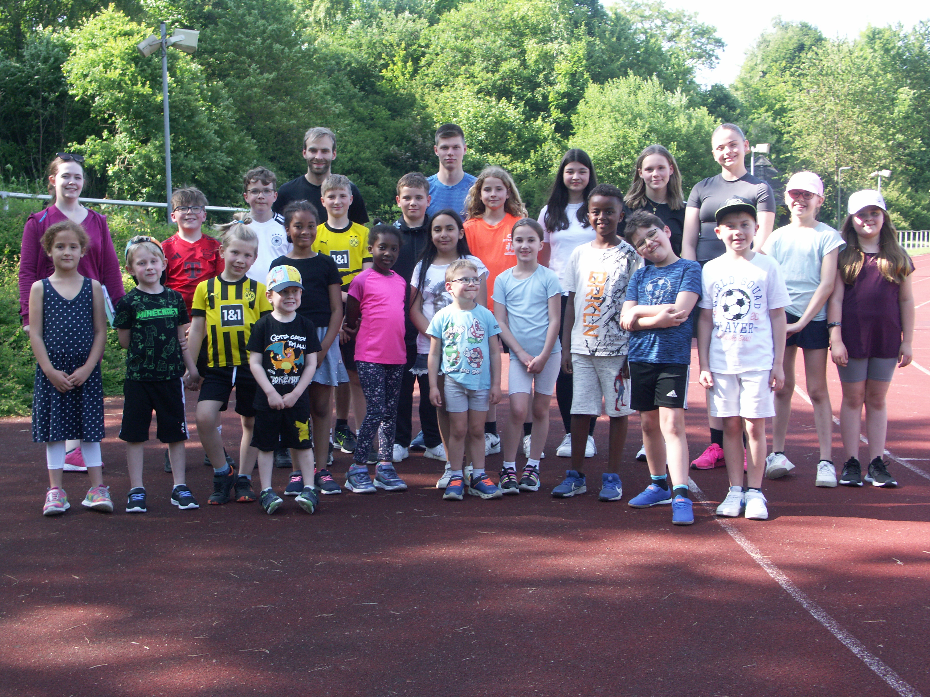 Angelina Droletz hat mit ihren Helferinnen und Helfern Gilbert Luig, Leni Voss und Helene van der Shoot, fast 100 Personen auf den Schorensportplatz geholt um das Deutsche Sportabzeichen (Digitale) abzulegen. Am Start war die Seepferdchen-Gruppe, die Wasserfreunde Warstein und die Fortgeschrittenen Schwimmer. In diesem Jahr ist es ihr gelungen sogar fast 10 Eltern zum mitmachen zu überreden. Tatsächlich waren diesmal sogar zwei männliche Sportler bereit sich sich den Anforderungen des Sportabzeichens zu stellen.